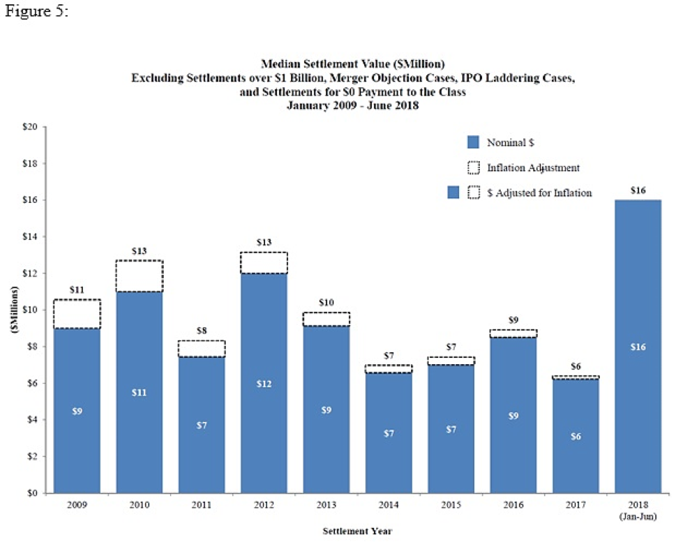 As Figure 4 shows below, after a significant decrease year-over-year from 2016 to 2017, average settlements jumped from $25 million in 2017 to an eye-popping $124 million in the first half of 2018. As we have noted in previous updates, in any given year the statistics can mask a number of important factors that contribute to any particular settlement value. Average and median settlement statistics also can be influenced by the timing of large settlements. In 2017, there were no settlements at $1 billion or greater; while in the first half of 2018, $3.0 billion of a total $3.8 billion of aggregate settlement value is accounted for by settlements of $1 billion or more. Removing settlements over $1 billion shows a much smaller increase in the average settlement—from $25 million in 2017 to $28 million in the first half of 2018. However, as Figure 5 shows, the median settlement value, even when excluding settlements over $1 billion, still shows a significant increase from $6 million in 2017 to $16 million in the first half of 2018. In the first half of 2018, the percentage of settlements above $100 million shows a continuation of a downward trend—from 15% in 2016 to 8% in 2017 to 6% in the first half of 2018. The percentage of settlements below $10 million decreased substantially from 61% in 2017 to 39% in the first half of 2018, while over the same period settlements valued between $20 million and $49.9 million increased substantially from 14% to 32%.