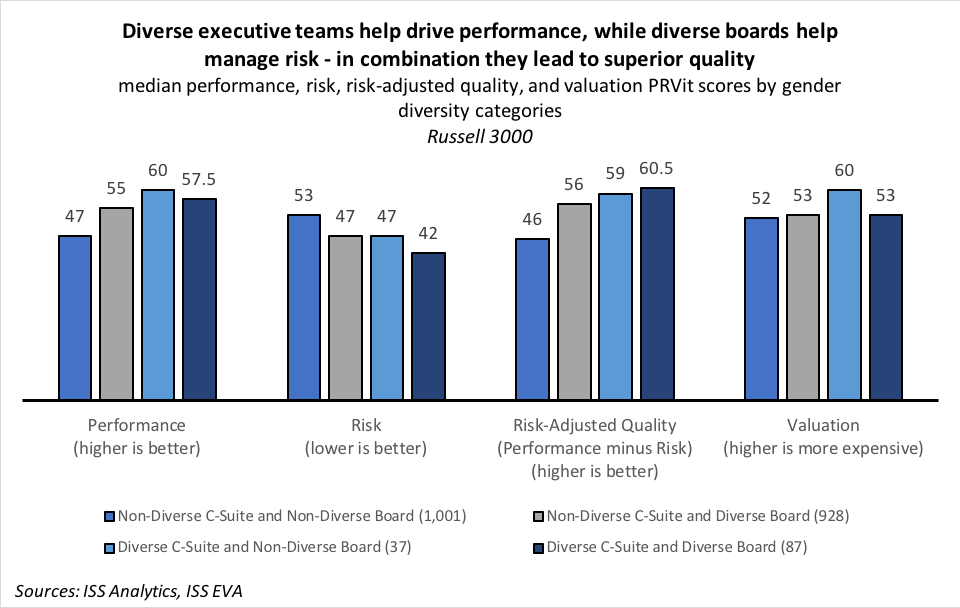 We found that companies that lack diversity in the boardroom and in the C-Suite had the worst results in terms of performance, risk, and valuation, while companies with diverse executive teams exhibited the best results even when their boards were non-diverse. However, board diversity appears to consistently correlate with a lower risk profile. Overall, companies that combine diversity in the C-suite with diversity in the boardroom have the highest scores in terms of risk-adjusted quality. These results suggest that diverse executive teams may be better able to drive superior performance results, while diverse boards help companies improve their risk management. Given the executive responsibilities of management and supervisory responsibilities of the board, these results make intuitive sense. A median test analysis confirms the statistical significance of the results, as the P values are less than 0.005 for the Performance, Risk and Risk-Adjusted Quality scores. However, further studies may be required to establish a potential causal relationship.