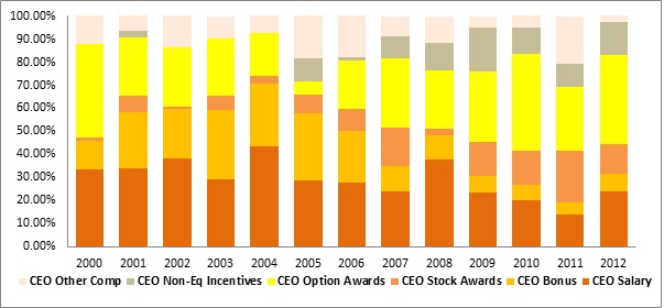Our research is based on a hand-collected data-set that includes the compensation distribution of the whole management team prior to the offering. As a consequence, this approach considers the implications of both absolute CEO pay and relative CEO pay, i.e., the pay disparity between the CEO and other senior executives. Accordingly, we begin our empirical analysis by highlighting some important descriptive evidence. Figure 1 reveals that executive compensation exhibits an increasing trend (apart from 2012, which is probably due to the passage of the JOBS Act, aiming to minimize the regulatory burden of smaller firms that plan to go public). It also shows a persistent pay disparity between the CEO and the other executives. Furthermore, Figure 2 reveals a significant dependence on long-term forms of compensation (such as stock and option awards). Do these patterns represent managerial entrenchment? Or, do they reflect an equilibrium outcome arising from an efficient labor market?