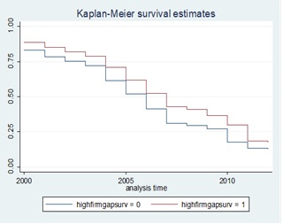 | Figure 3: Survival Estimates of IPO Firms with a Highly (blue) or a Poorly Compensated CEO (red) | Figure 4: Survival Estimates of IPO Firms with Large (blue) or Small (red) Pay Disparities |