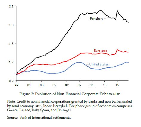 Investment expenditure in Europe collapsed in the aftermath of the 2008 global financial crisis. This collapse followed a boom during which the corporate sector borrowed heavily (Gopinath, Kalemli-Ozcan, Karabarbounis, Villegas-Sanchez, 2017). Figures 1 and 2 illustrate the extent of the increase in leverage and the collapse of investment in Europe as compared with the United States. These developments were particularly pronounced in peripheral European economies.