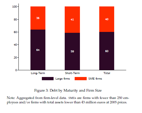 Our analysis is based on a comprehensive firm-level data set including small private firms from the ORBIS/AMADEUS database. Figure 3 shows the importance of covering firms of all sizes, as small firms account for about 41 percent of total short-term debt. To match firms to their banks, we use information on the firms’ main relationship bank and then match the bank’s name and address to its balance sheet using the information in BANKSCOPE. In order to separate banks’ exposure to their home countries’ risk from that of other nations, we use confidential ECB data, which has nationality information on sovereign exposure. The final matched dataset consists of over 2 million observations, covering firms and their banking relationships in eight European countries from 2000 to 2012.