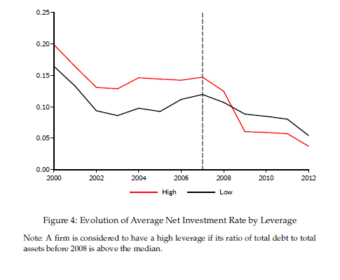 We assess the differential impact on investment of different levels of leverage and debt maturity between the pre-crisis (2000-2007) and post-crisis (2008-2012) periods. We base the assessment on aggregate demand shocks using four-digit industry-country-year fixed effects. These effects will absorb the impact of changes in credit demand for the four-digit sector that our firms operate in as well as any changes in country-level demand conditions, including those arising from changes in sovereign risk and general uncertainty conditions. We also control for bank fixed effects to capture the role of pre-existing bank relationships. Figure 4 shows the evolution of net investment over time, broken down by firms with high versus low financial leverage. It is clear that investment declines more markedly during the crisis for firms with high financial leverage, while investment patterns pre-crisis display a parallel trend across both groups of firms.