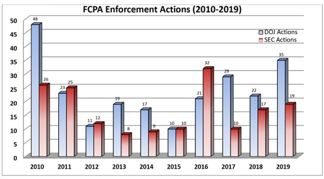 The below table and graph detail the number of FCPA enforcement actions initiated by DOJ and the SEC, the statute’s dual enforcers, during the past 10 years.