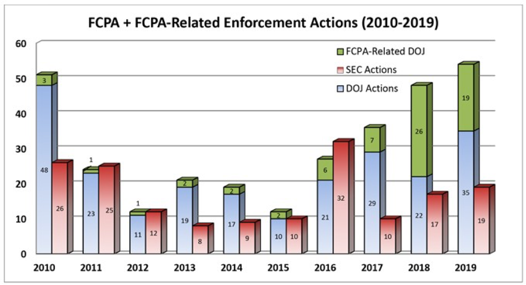 2019 was, by many measures, the most significant year ever in Foreign Corrupt Practices Act (“FCPA”) enforcement. More than $2.6 billion in corporate fines sets a new high-water mark, driven by the two largest corporate resolutions in the statute’s history. Fifty-four FCPA enforcement actions, or 73 total cases including ancillary actions, brought by the FCPA Units of the U.S. Department of Justice (“DOJ”) and Securities and Exchange Commission (“SEC”), each rank second only to 2010 in the annals of FCPA enforcement. Four FCPA and FCPA-related trials is the most ever. Add on top of this new FCPA enforcement policy guidance from DOJ, an expanding body of case law on the FCPA and related offenses, among many other developments, and there is a strong argument that international anti-corruption enforcement has never been more robust.