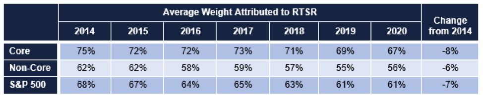 Since 2014, the average weight given to RTSR as a metric has been slowly decreasing, a trend for both Core and Non-Core companies. The table below displays the average weight attributed to RTSR (excluding RTSR modifiers).