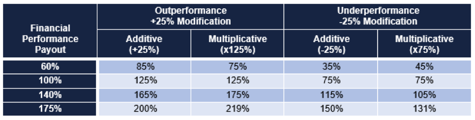 Modifiers may be applied in additive or multiplicative manners. An additive modifier adds or subtracts from pre-modifier performance share payouts (e.g., financial performance payout plus 25% for outperformance). A multiplicative modifier uses a performance factor which is multiplied by pre-modifier performance share payouts (e.g., financial performance payout multiplied by a factor of 1.25, or 125% for outperformance). Among S&P 500 companies using a two-way modifier, 54% use a multiplicative method and 46% use an additive method.