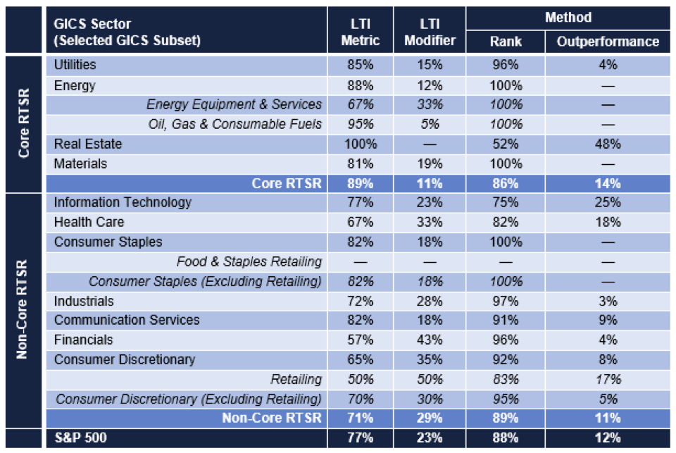 Energy and Utilities companies continue to be the primary users of RTSR across the S&P 500, with 93% of Energy and 96% of Utilities companies using RTSR. Real Estate and Materials companies report high RTSR prevalence as well, 87% and 75%, respectively. Within each of these high-prevalence sectors, companies tend to face similar commodity price pressures or economic similarities, potentially rendering RTSR a more reliable method for identifying financial and operational outperformance via market performance. (We refer to Energy, Materials, Real Estate, and Utilities companies collectively as the “Core” group of RTSR users, and the remaining companies as “Non-Core.”)
