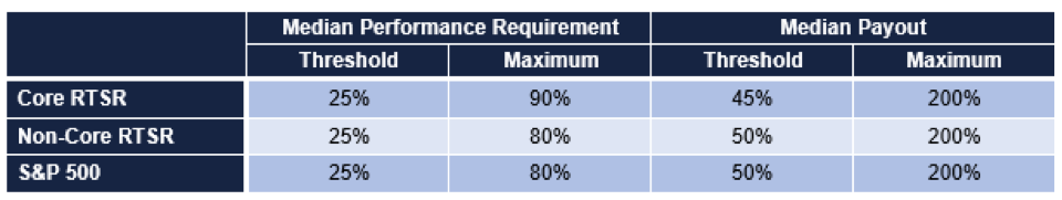 Note: When RTSR is used as a modifier, the most common performance hurdles are 25th and 75th percentiles (threshold and maximum, respectively), and the median/mode percentage modifier is +/- 25%. Data displayed in the above table excludes performance ranges for companies using RTSR as a modifier.