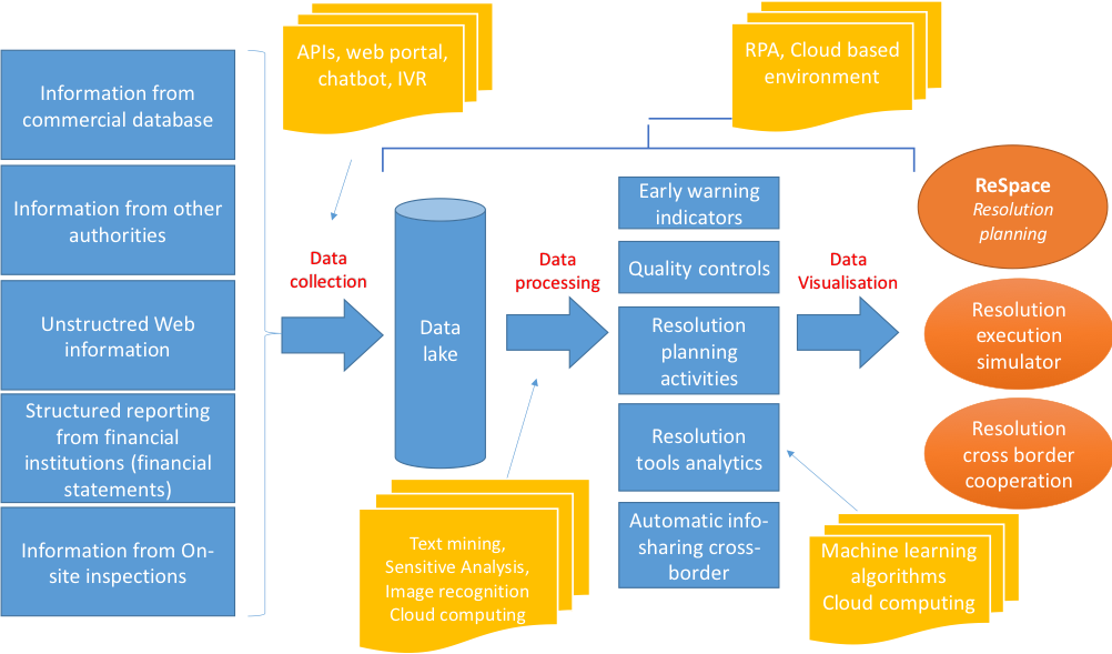 The ResTech toolbox relies on state-of-the-art Big Data architecture and technologies. Resolution authorities may move from data warehouses to data lakes, which enable the collection of structured reporting and unstructured web-based information. Collected data are processed in cloud computing environments and robotic process automation systems. Machine learning algorithms support the analytical work underpinning the definition of early warning indicators and the calibration of the resolution strategy that best minimizes the negative externalities of a crisis at any given time.