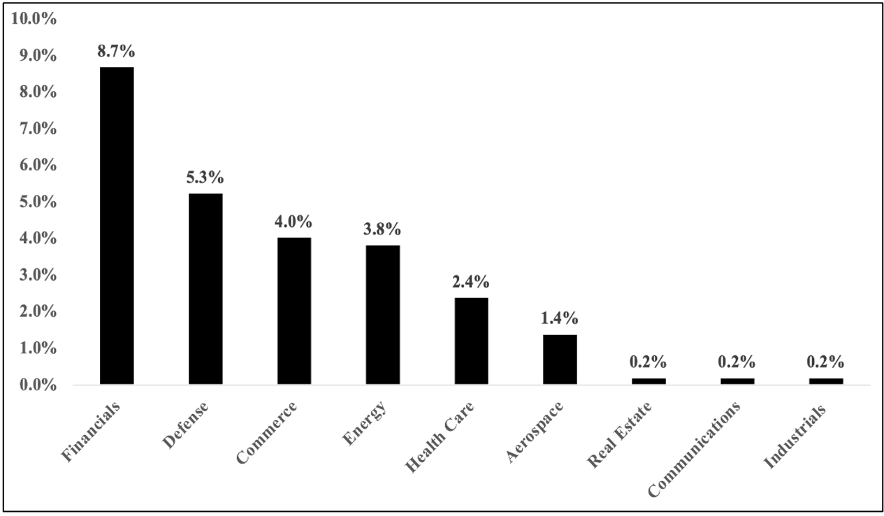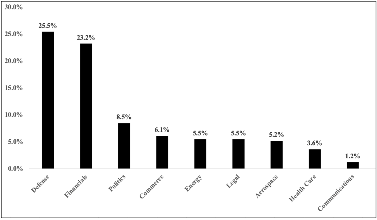 Similarly, we analyzed the transitions of workers within the same field, known as same-sector transitions. We found that of 495 people in our sample, only 128 transitioned within the same sector where they previously worked. Here, too, we see that the extent of revolving-door movement varies according to the sector – the financials and defense sectors, for example, had significantly more movement than the communications and industrial sectors. Figure 3 highlights these variations: