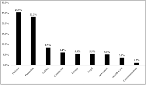 First, we note that 495 of 6,430 (7.7 percent) directors and executive officers in the S&P 500 worked in the government before taking their current jobs. Despite the minority of executives in our sample with government experience, we also found that 298 of 500 firms hired at least one former government official for a leadership position, highlighting that most firms value some public sector experience in their executives.