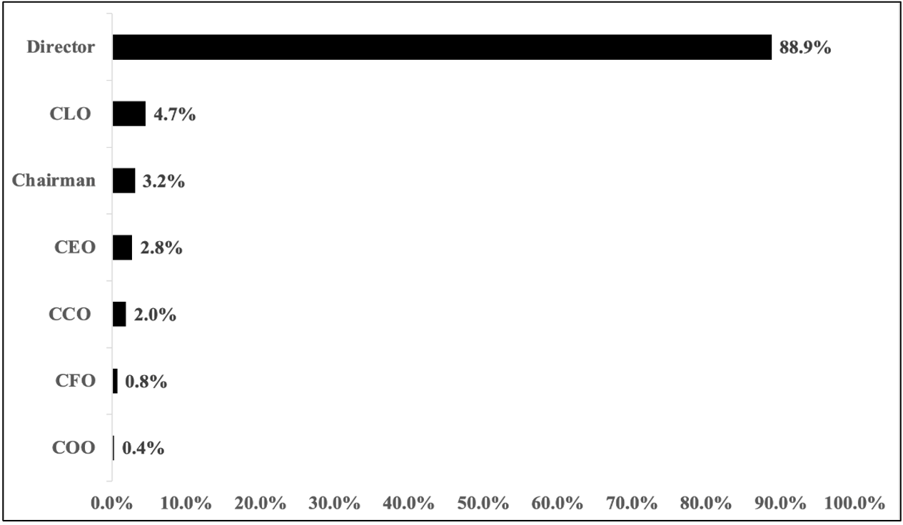 Fourth, we analyze the positions that people hold after the move to S&P 500 firms. We note that a majority join boards of directors. Interestingly, we also found that a significant number took positions that are often overlooked in the literature, including chief legal and compliance officers. Positions like chief financial and operations officers were represented less in our sample. Figure 4 shows these variations: