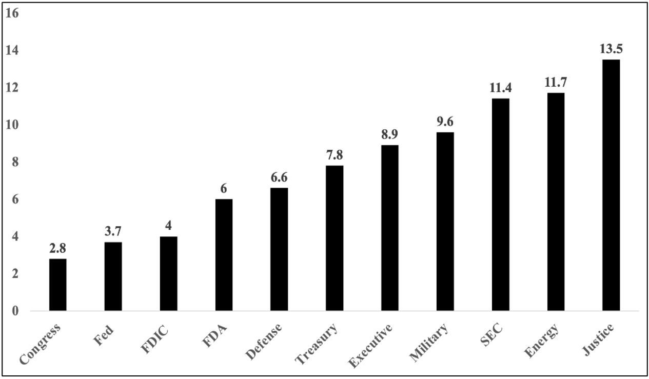 We also show that the desirability of the revolving door as expressed in the literature can change depending on the agency or department. For example, Randall and Thomas contend that the revolving door relating to SEC division heads may expose regulators to cultural biases (Randall & Thomas, 2019), while Tabakovic and Wollmann found that the transition of former officials from the U.S. Patent and Trademark Office is consistent with regulatory capture (Tabakovic & Wollmann, 2018). Conversely, Palmer and Schneer explain that their findings on the transition of former congressional officials are consistent with theories of human capital (Palmer & Schneer, 2016). We found similar variations with respect to the sectors workers left.