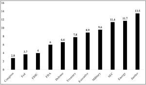 Second, we show that the extent of the revolving door varies among different public agencies and departments. We found more people moving from agencies and departments like the military, the Federal Reserve, and the Department of Defense, and we found few or none moving from agencies and departments like the Federal Trade Commission, the Federal Aviation Administration, and the Environmental Protection Agency. Figure 1 below highlights some of the variation: