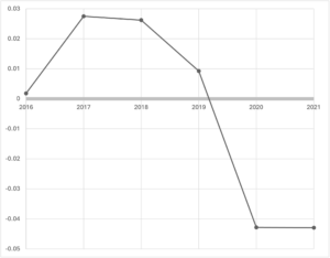 The Pearson correlation between ESG scores and the number of restatements by year